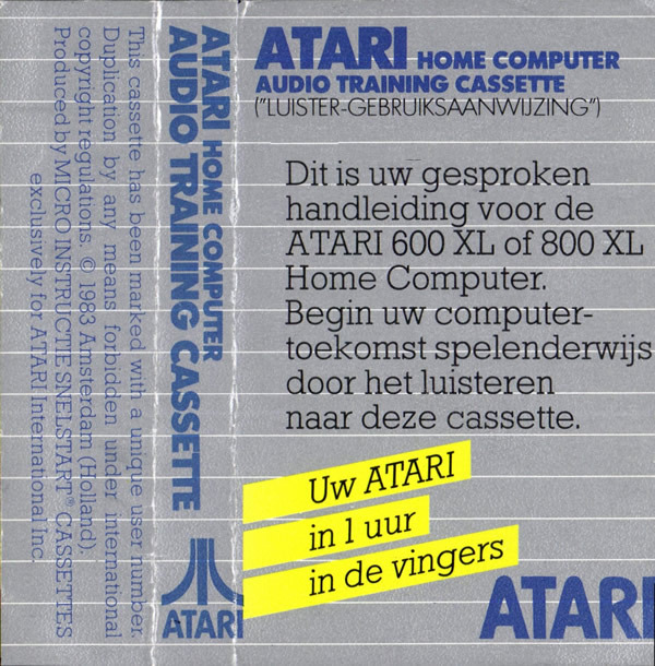 This cassette is an audio cassette, which was included with the Atari 600XL and 800XL in The Netherlands. This cassette teaches the user how to use the Atari Home Computer and also includes several Basic lessons. The presenter of this course is Meta de Vries, a well-known Dutch radio presenter from the eighties. Originally this cassette was made by Aackosoft, a Dutch software distributor. But Atari bought the rights in 1983 and changed the packaging to match the Atari line of software.MP3-file:#